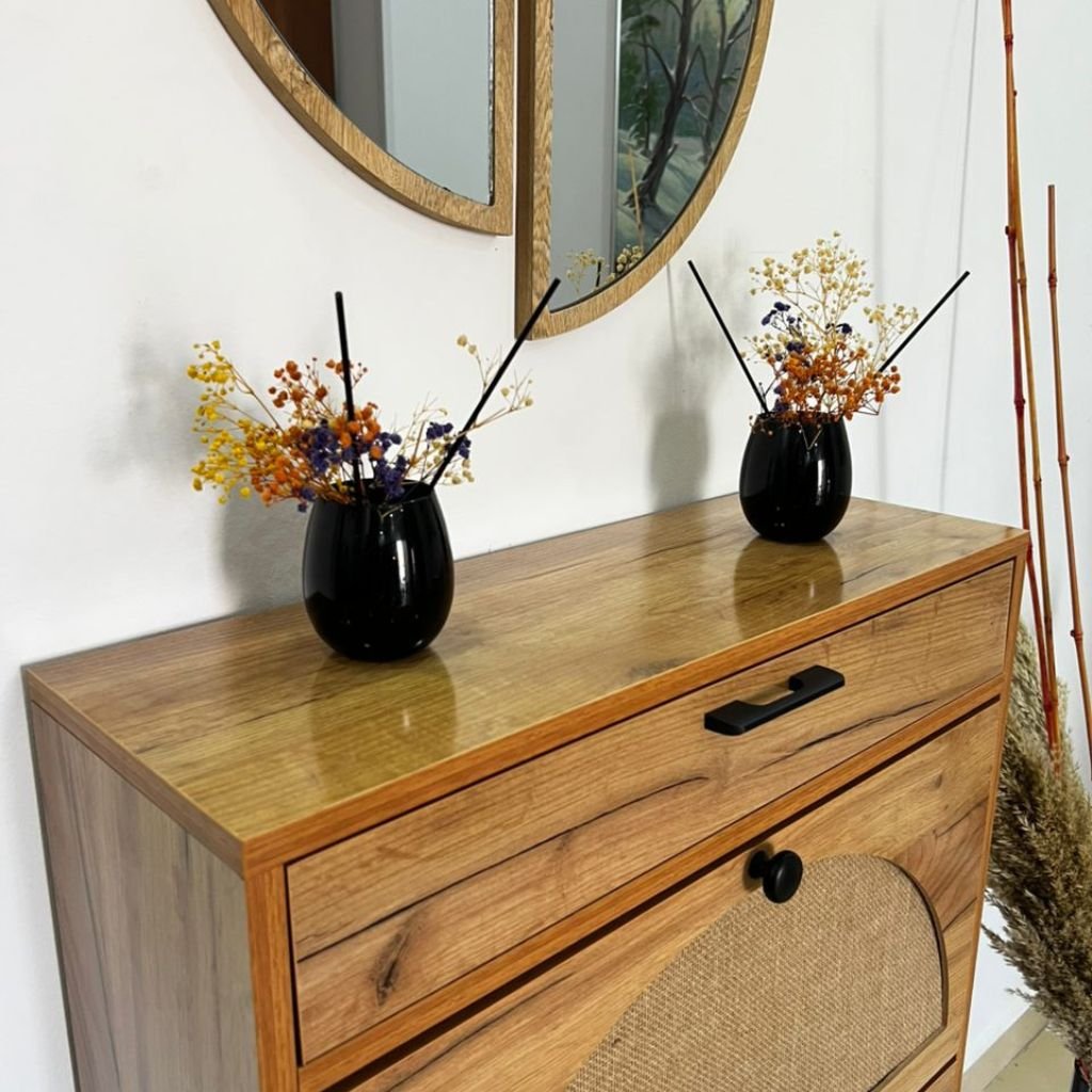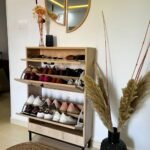 Plateau supérieur pour cadres photo et plantes. Petit faux tiroir pour ranger clés, portefeuilles et petits objets. Deux tiroirs rabattables permettent de ranger jusqu’à 14 paires de chaussures (selon la hauteur et la pointure), et des étagères intérieures réglables et amovibles pour répondre à vos besoins de rangement.
